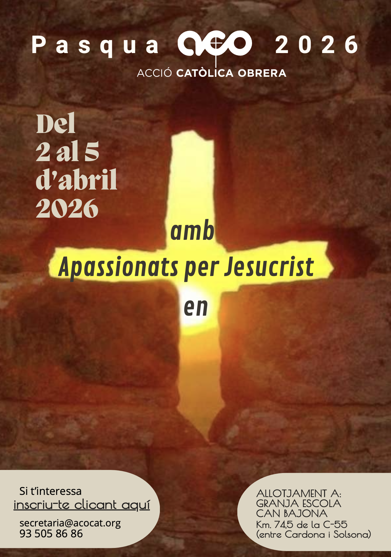 Des de l’ACO ens conviden a participar de la PASQUA que han preparat amb molt de carinyo. Apassionats amb, per, en Jesucrist PODEU VEURE AQUI EL PROGRAMA I INSCRIPCIONS! Voleu viure una Pasqua diferent, amb sentit comunitari i compromís? Us convidem a participar en la Pasqua Obrera amb l’Acció Catòlica, una experiència de convivència, reflexióLlegir més